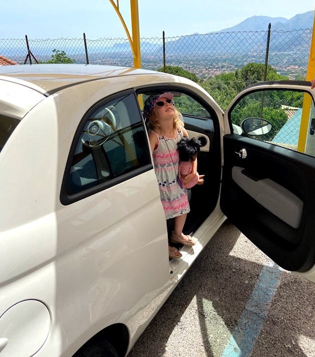 Wycieczkę zaczęliśmy zaraz po śniadaniu. Przy okazji Piotrek dorzucił nową Złotą Zasadę – zawsze oglądaj wypożyczany samochód zanim zapłacisz i cokolwiek podpiszesz. Generalnie prosiliśmy o samochód pięcioosobowy, a dostaliśmy fiata cinquecento, jak na załączonym obrazku 🙂 Mimo to sam samochód polecamy gorąco – super skrętny i idealny na wąskie górskie dróżki wiodące do Monreale. Zdecydowanliśmy się na wypożyczenie auta przy pomocy hotelu z SicilTours i wynioslo nas to 90 Euro na dobę. Rodzice Piotrka skorzystali z EuropCars i za dwa dni wypożyczenia Fiata Panda zapłacili 170 Euro.